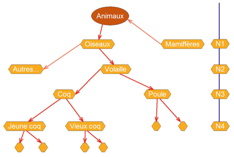 Ainsi dans une hiérarchie où apparaît Volaille il est facile de placer Poule et Coq comme ses héritiers, puisqu'on admet facilement que toute poule et tout coq EST UNE volaille. En revanche il est plus délicat de placer ensuite Poussin, Coquelet et Poulet : le poussin devient successivement coquelet puis poulet, jeune volaille soit mâle soit femelle.